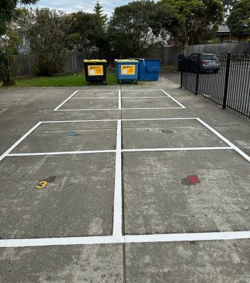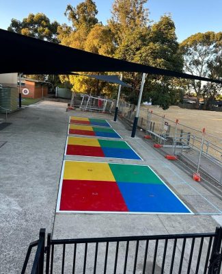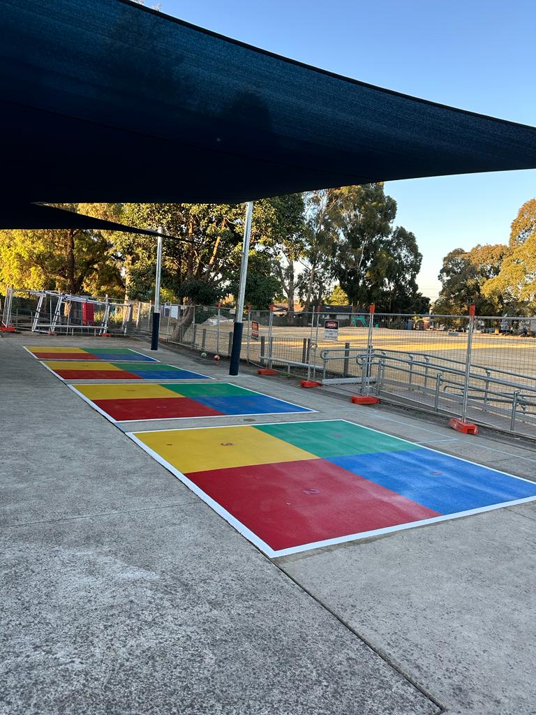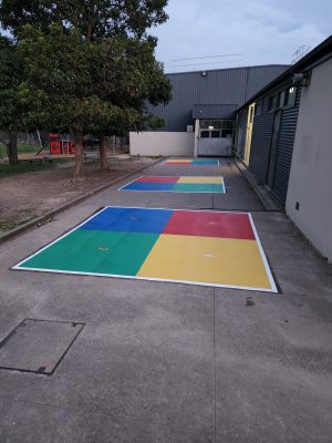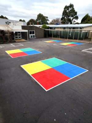 We were approached by Assistant Principal at Templestowe Heights Primary School to renew their 4 squared courts and add some new solid 4 squared courts to their playground. It was important that the markings were anti-slip so could be utilized in all weather and that they would be long lasting.
