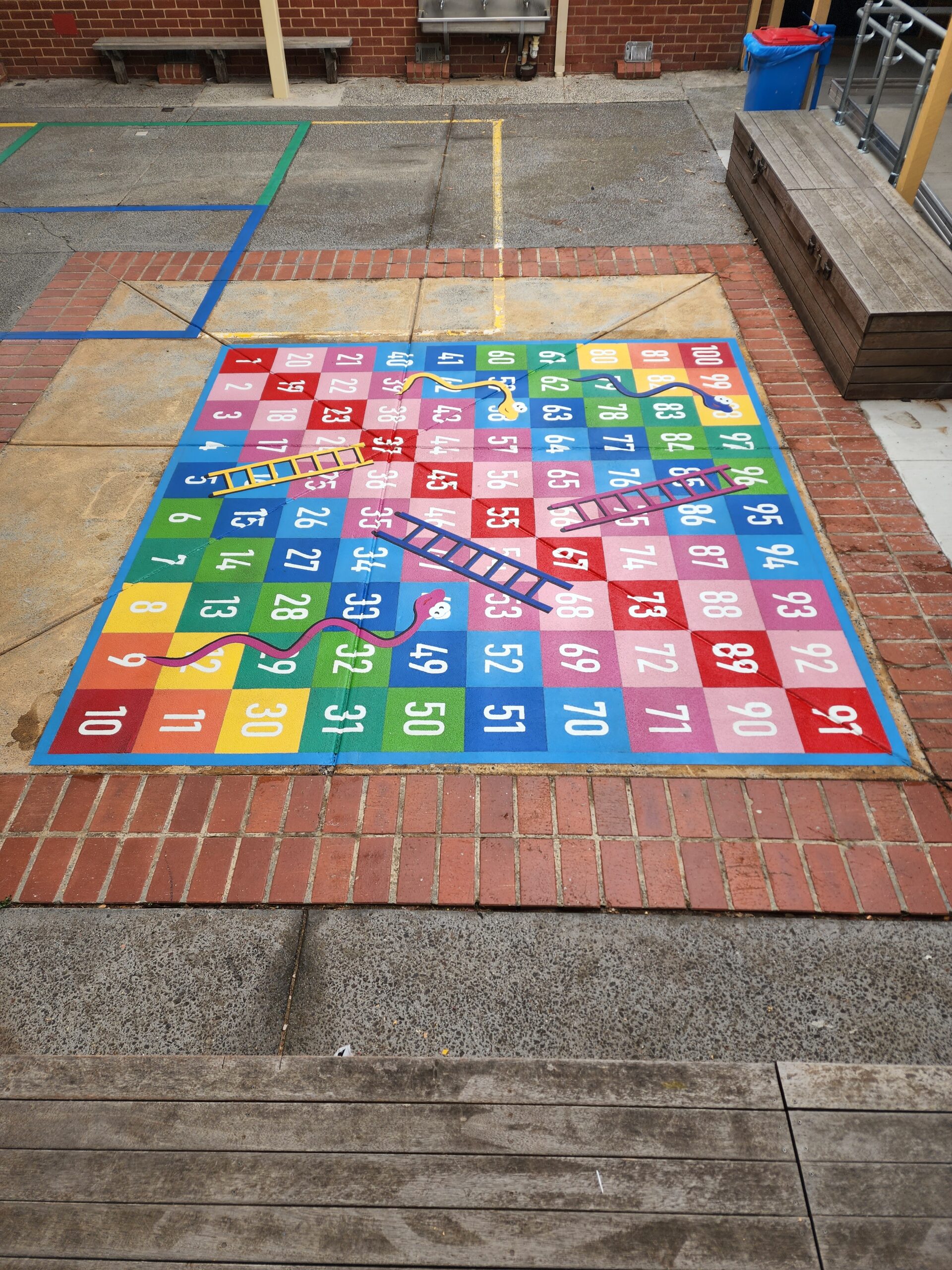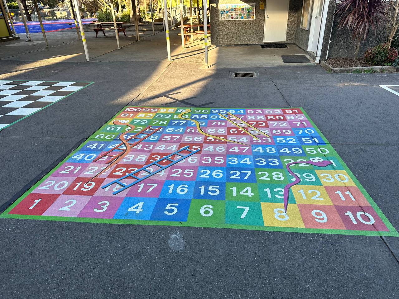 Our team at PAVEMARKING worked on-site during the school holiday to apply an exciting selection of playground games. These included a 3-way hopscotch, an alphabet snail and refreshing the bat tennis courts with bright solid colours. The centre piece of the installation was a large map of the world which expresses the diversity of the school’s pupils. It’s also a great learning tool. A colourful numerical snake and vibrant alphabet jump was a great way to help the younger students learn the numbers and alphabet. The students all agree that the giant dartboard and engaging snake and ladder are not only attractive but are also fun to play on.