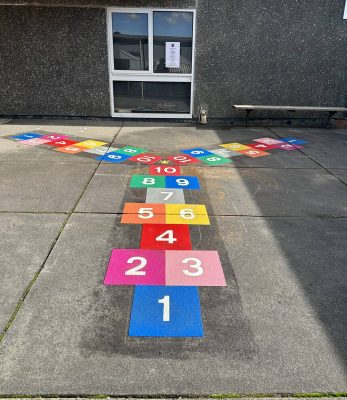 Upon hearing about a local school’s willingness to renovate their tired playground, Pavemarking approached Glen Katherine Primary School to see if there was anything we could do to help. Glen Katherine Primary has over 560 pupils from a mix of different nationalities. They aim to provide a warm, happy, and stimulating environment in which the children enjoy learning and playing. The team at Pavemarking went on-site in March to apply an exciting selection of games, including a times table, phonics table, twister, fitness trail, the fraction circle and some other games.